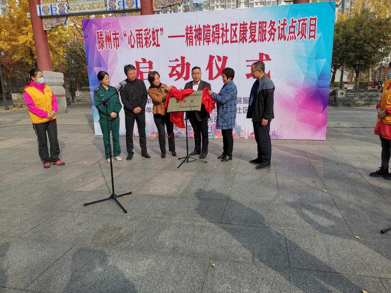 2020年10月29日上午,滕州市“心雨彩虹”——精神障碍社区康复服务试点项目在荆河街道马号街社区启动,滕州市民政局、荆河街道、益馨社会工作、滕州泰康精神病医院等有关负责人参加了项目启动仪式。